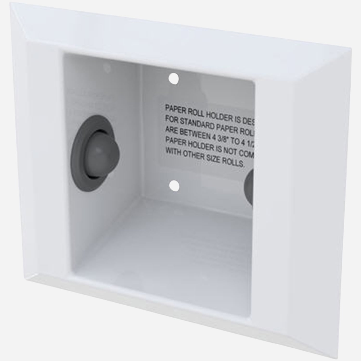 Paper Holder is intended to be installed on the finished wall from the front. Paper holder housing fabricated from 16 gauge, type 304 stainless steel with all exposed surfaces powder coated white. Flange perimeter edges are beveled to provide a uniform flat surface, ensuring a tight fit on the wall. The paper holder is furnished with 1/4”-20 UNC tamper-resistant screws for use with wall anchors to be provided by others. Spring-Loaded, Spindle Buttons holds the toilet paper roll. Holder accommodates household size roll, typically 5 x 4 inch diameter (127 x 102 mm). The holder will need to be recessed 2-7/8" (73 mm) into the finished wall.
