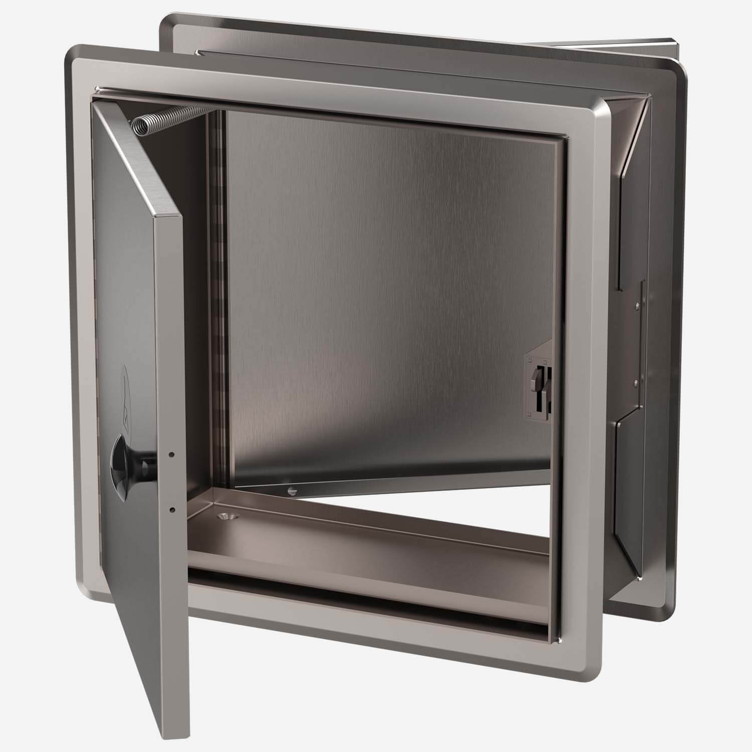 Recessed In-Wall Cabinet, Door and Frame are 16 gauge (0.063) type 304 stainless steel with de-burred edges. Unique assembly allows Recessed Box to adjust to suit a Wall thickness from 3" (76 mm) to 5-1/2" (140 mm). Assembly is available with Snow White Enviro-glaze® Powder Coat (-EG10) or in stainless steel with exposed surfaces polished to a #4 satin finish.