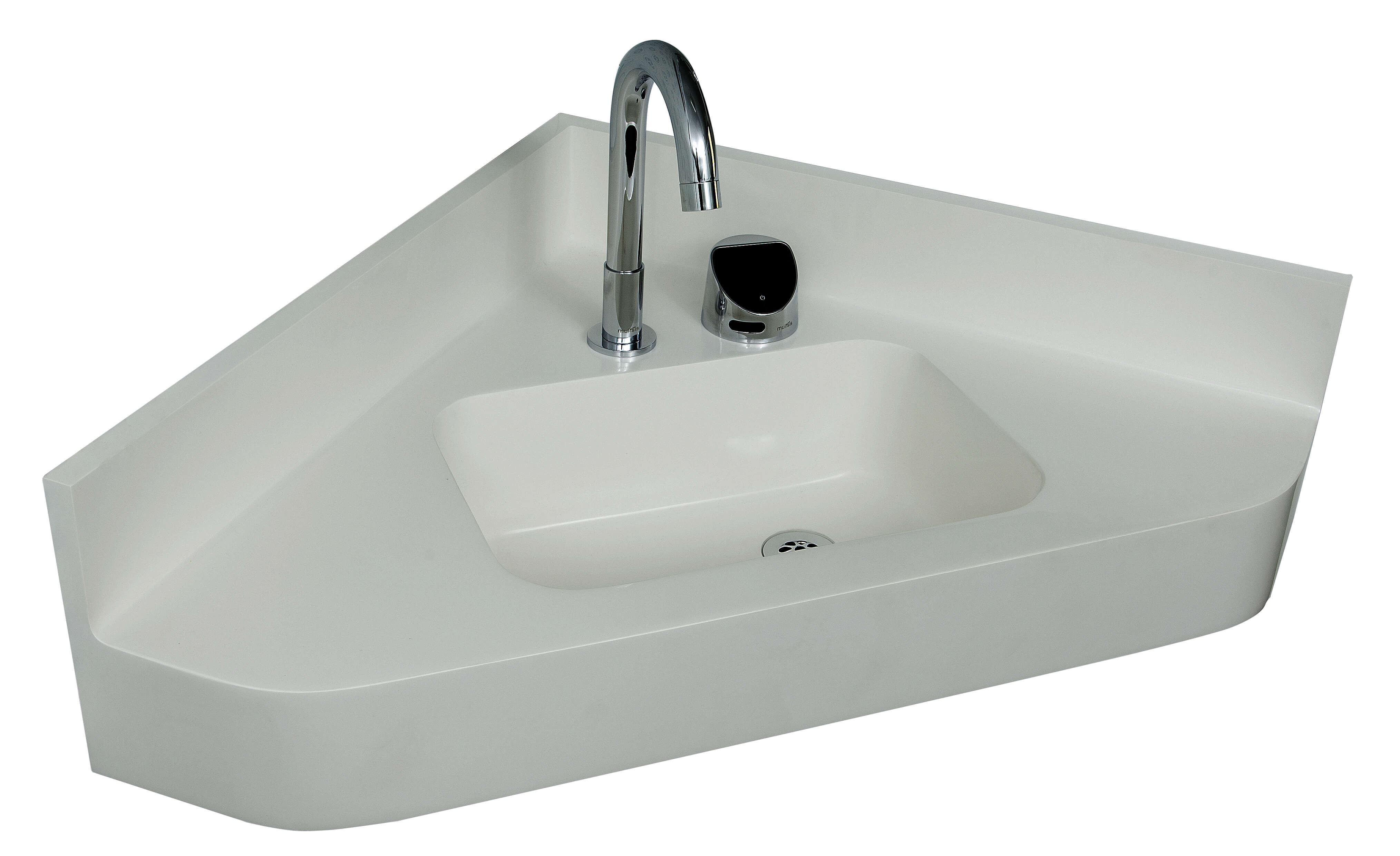 This wall-mounted Corterra® solid surface sink is ideal for corner locations with limited space. The sink is intended for general use by medical staff, patients, and food handlers. Standard offering includes OCC11M Blanco (white) Matte Corterra® solid surface. Other Corterra colors are available.