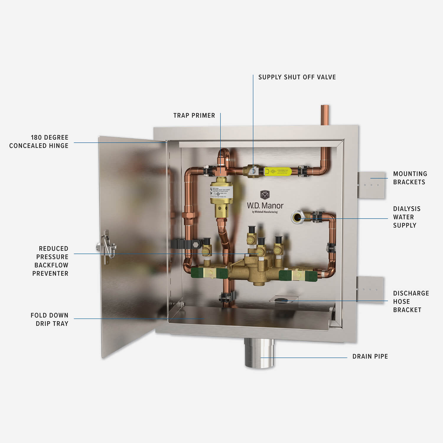 The W.D. Manor by Whitehall dialysis wall box protects patients at their most vulnerable, minimizes liability, and promotes significant job savings for the installer.