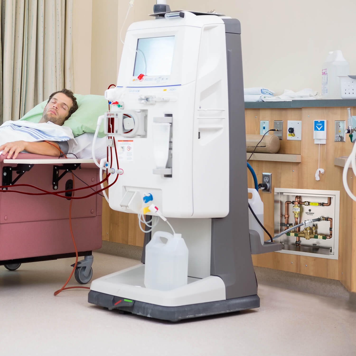 Each dialysis box is prefabricated and pre-plumbed and includes an integrated reduced pressure backflow preventer. This eliminates the need to pipe back to a shared backflow preventer and eliminates the possibilities of cross-contamination that can arise from that arrangement.