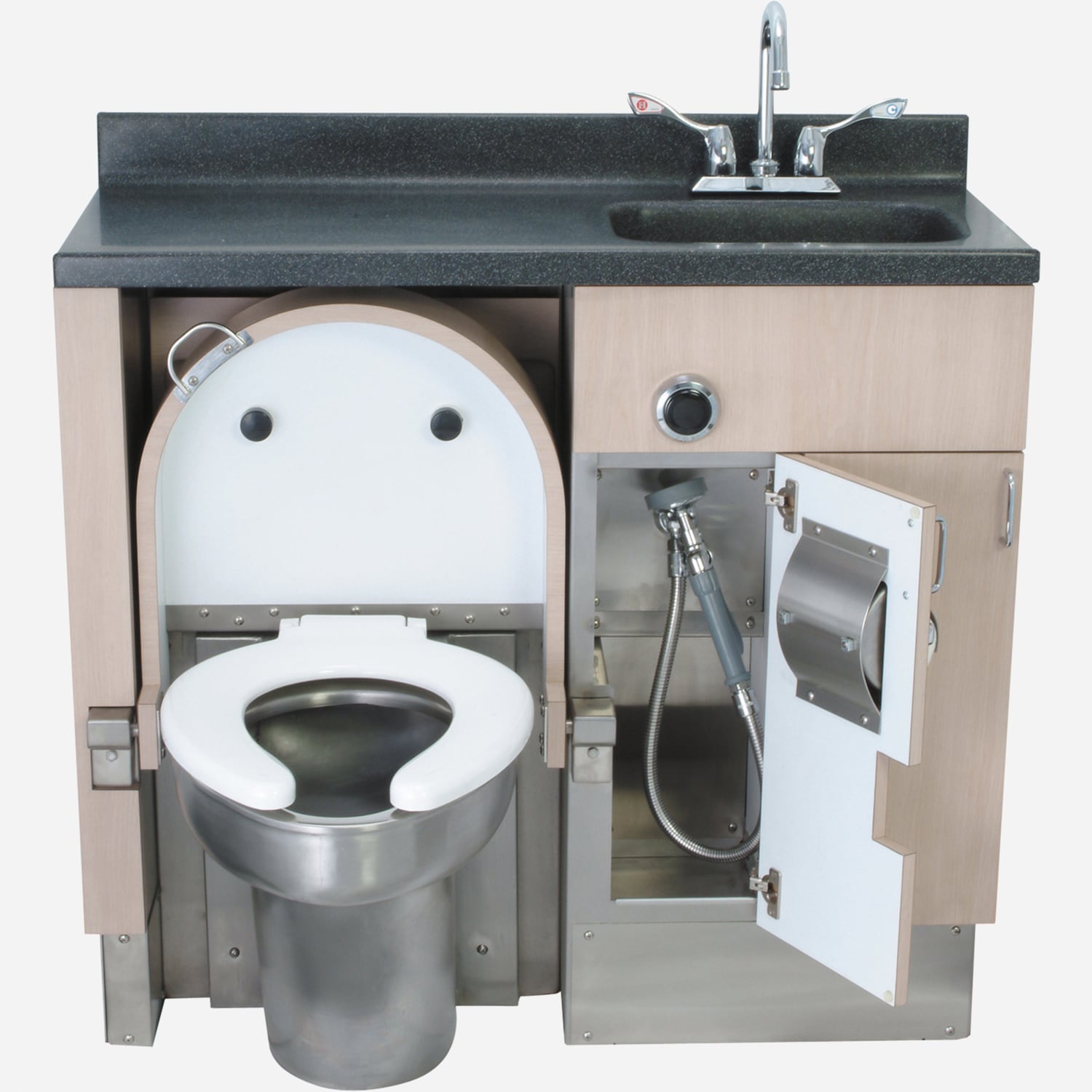 A 40-inch stainless steel frame cabinet, stainless steel toilet with a bed pan washer. Not only does this unit serve as a bedside seat when not in use, but also has additional storage space and the solid surface Corterra countertop and built in sink provides an extra work surface. This unit provides a convenient and sanitary solution for patients who may have trouble getting to a restroom located across the room.