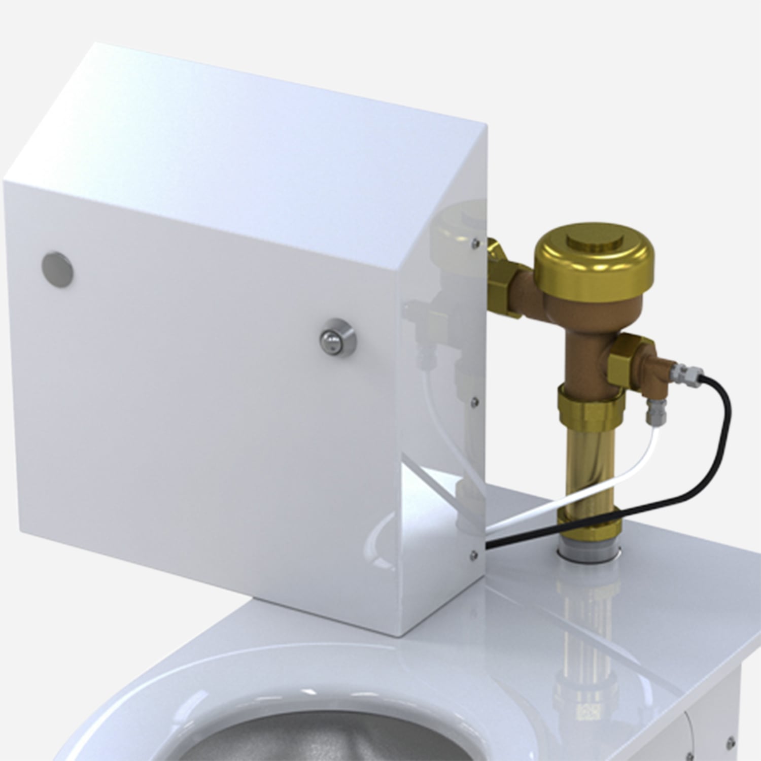 Providing a ligature-resistant solution, a top supply hydraulic toilet flush valve is covered by a stainless steel box with a sloped top. Holes are provided on the front of the box for the actuating push button. Designed for conservation, the toilet flush valve supplied operates with 1.28 gallons (4.85 liters) or 1.6 gallons (6 liters) per flush. For urinal, 0.125 gallons (0.47 liter) or 0.5 gallon (1.89 liters) are available.