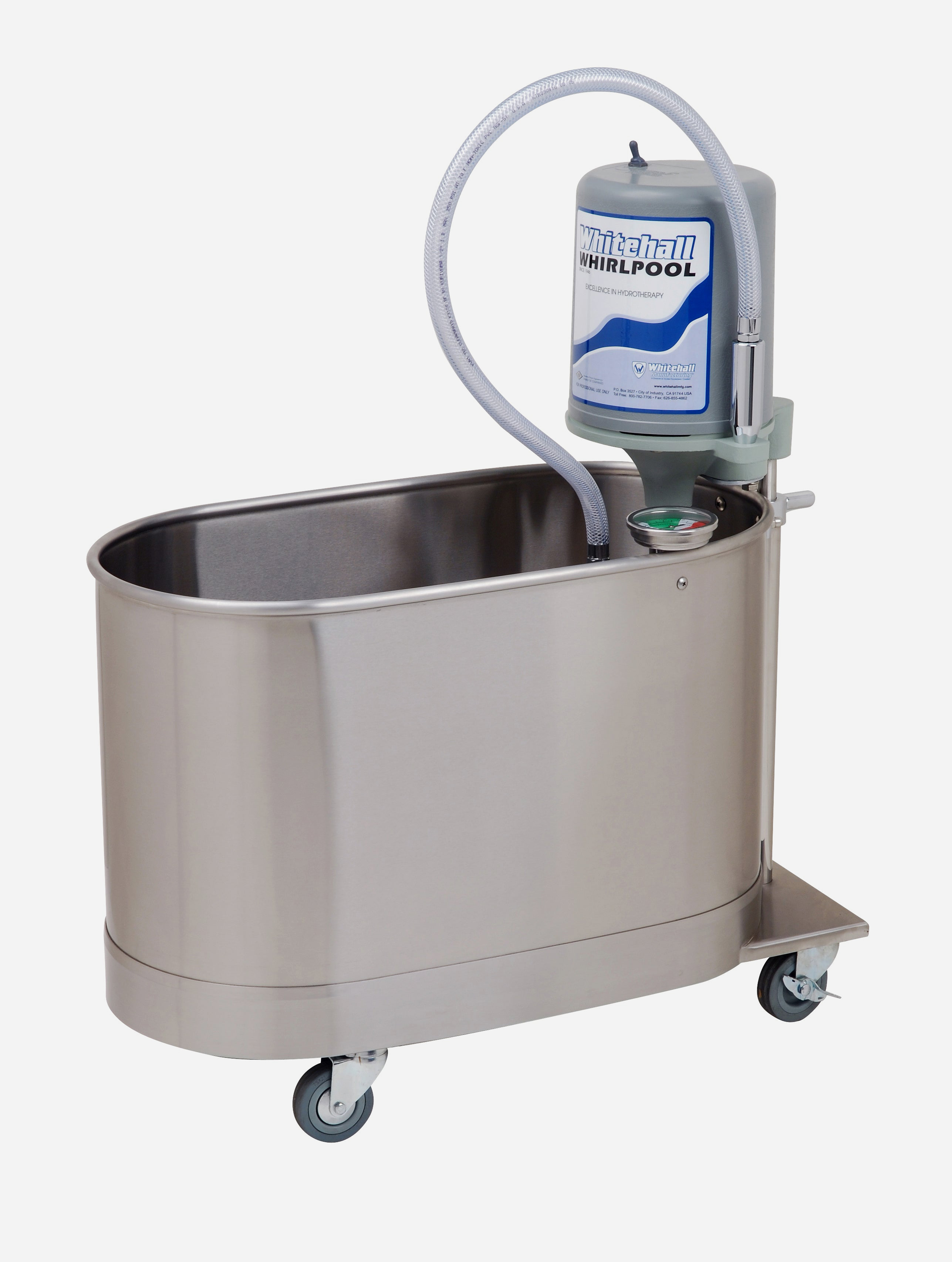 Whitehall® whirlpools can function as both whirlpool tubs and a cold tank by removing the turbine assembly and thermometer when cold temperature is required. The turbine assembly and thermometer can be replaced to covert the tank back to warm-water whirlpool use.