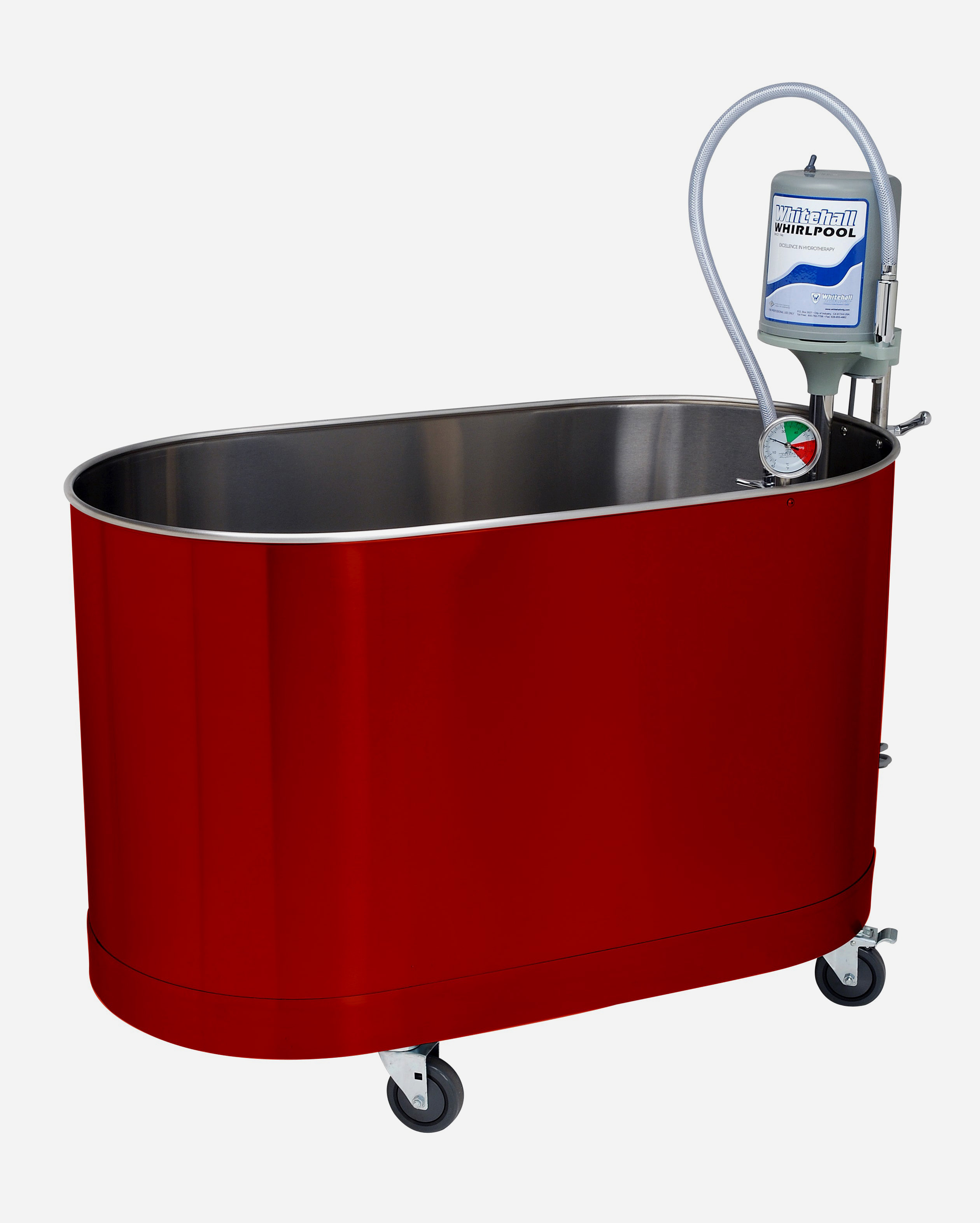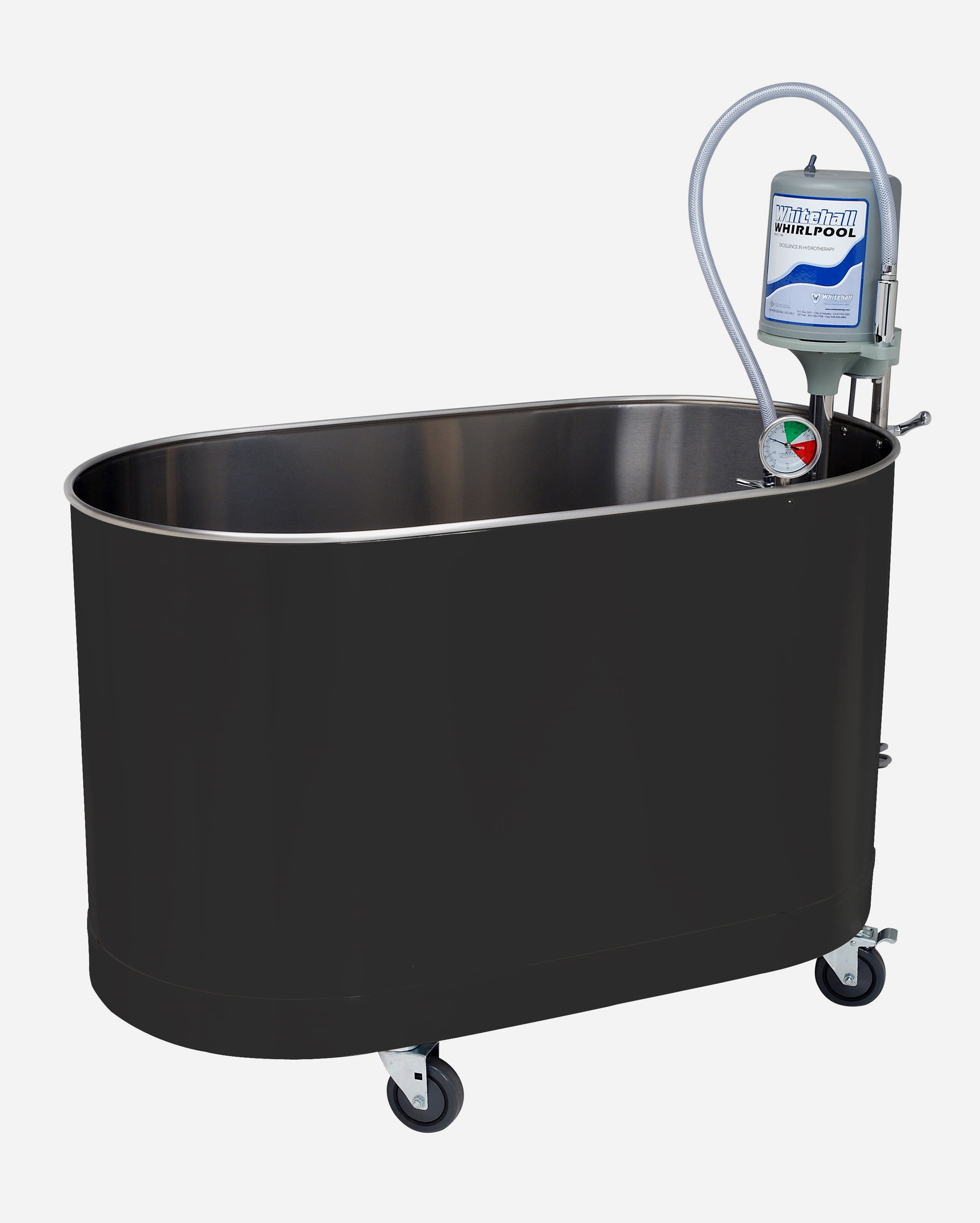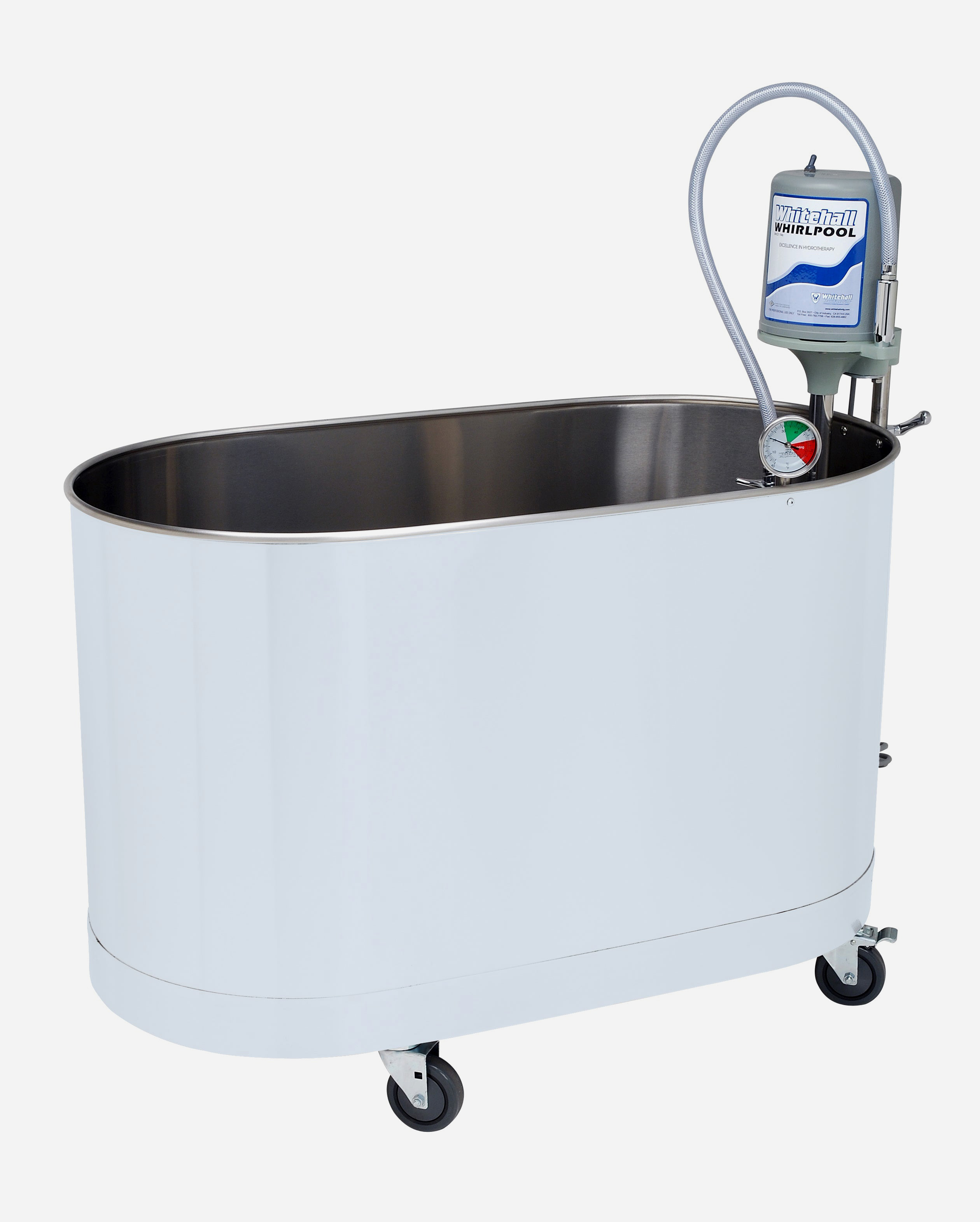 Whitehall® whirlpools can function as both whirlpool tubs and a cold tank by removing the turbine assembly and thermometer when cold temperature is required. The turbine assembly and thermometer can be replaced to covert the tank back to warm-water whirlpool use.
